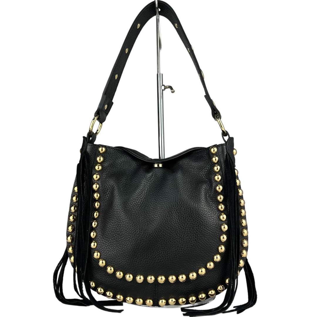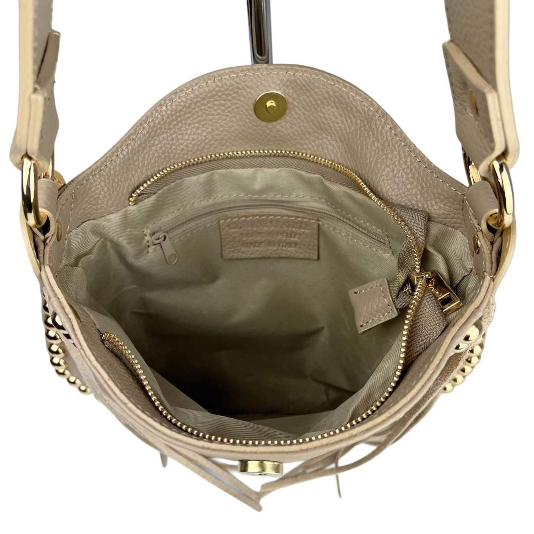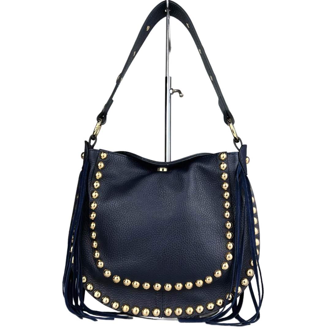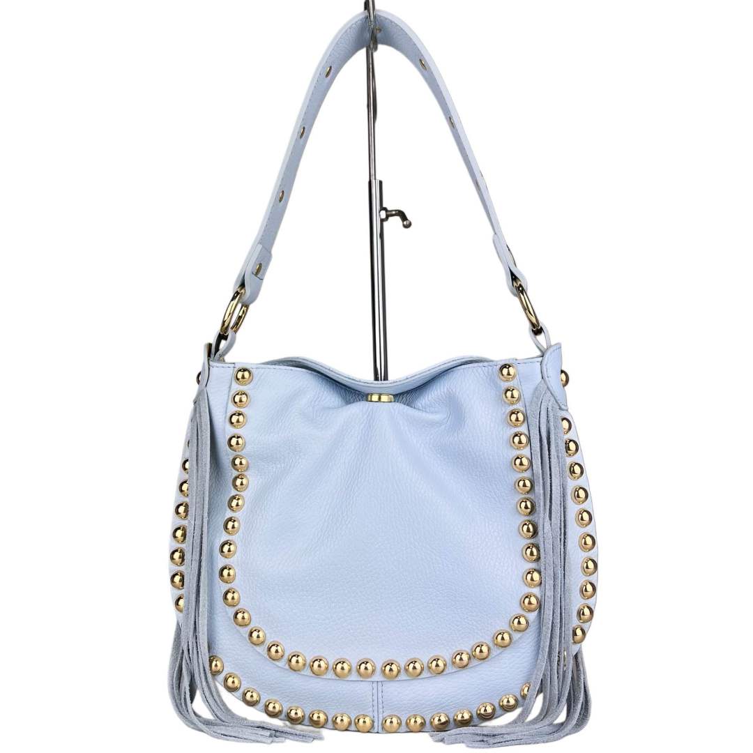 La Maëli small è un bellissima sacchetta realizzata in vera pelle martellata e decorata di borchie dorate.